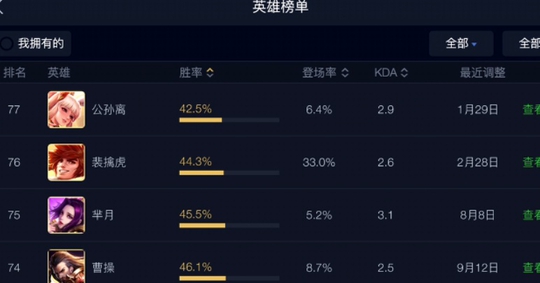 游戏内更新了英雄榜单的功能,入口在主界面右侧的社区中,在这个页面可以清楚的看到七十七个英雄的前一天胜率和出场率排名,了解时下版本哪个英雄较强势,同时也可以查看每个英雄最近一次更新调整的时间和内容。