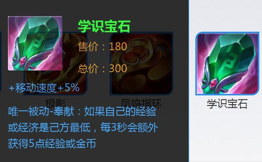 学识宝石也是小编非常喜欢的一个装备,其实这个装备不一定是辅助购买,有时候当你初期被压制,根本没法发育,金钱落后队友很多的时候也可以购买,大家可以看到这个装备,总价300售价180。三秒钟加5金币,一分钟就能增加100。可以说,只要一分多钟就回本了。何况还有经验和移速的加成呢,简直是一本万利呀!