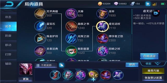虚无法杖:在后期敌方前排英雄购买了魔女斗篷、不死鸟之眼、抵抗之靴的情况下,其法术防御已经非常高了,这时候我们需要补充一件虚无法杖,提高自己的法术穿透能力,能够有效的增加干将对敌方前排的威胁力,避免出现一套技能打到前排身上不掉血的尴尬情况。