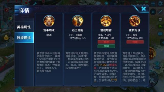 黄忠的主要加点技能,使用技能提高移动速度持续2秒,可以瞬间取消架起炮台的状态,被动增加攻击力(随技能等级最多加100点物理攻击)。黄忠没有位移技能,这个技能提高了黄忠的机动性,瞬间增加的移动速度可以帮助黄忠追击敌人或是逃跑时使用,强大的被动增加了攻击力,能让黄忠打出更高的伤害。