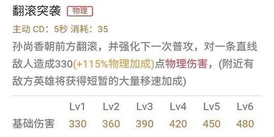整体解析:孙尚香最重要的技能,孙尚香向一个方向进行翻滚,可以跨越地形,也可以利用一技能来逃脱敌人的偷袭和追击,躲避敌人的技能和控制效果。翻滚位移后的下一次普攻具有更高的伤害,且具有更远的射程。