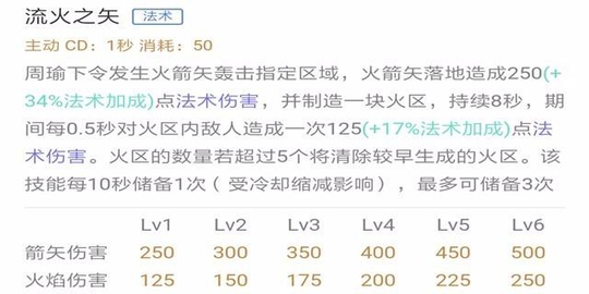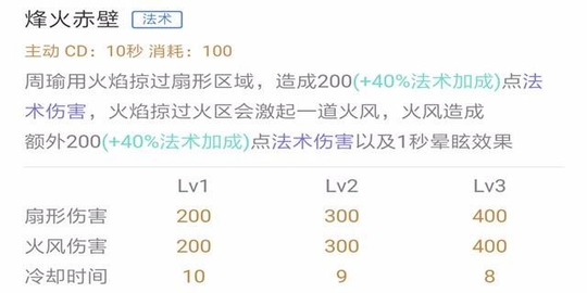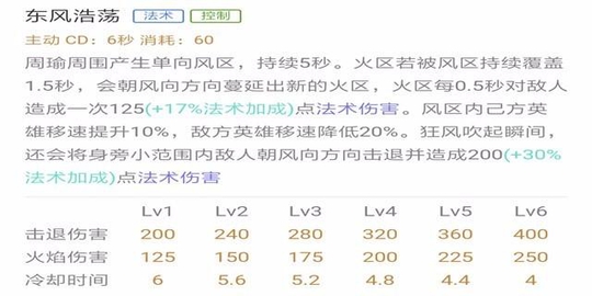 整体分析:对技能范围内的敌人造成伤害。如果技能触碰到火区,会形成一道火风,对敌人再造成一次伤害与1秒晕眩。,大招配合二技能能将周瑜的被动技能快速叠满,造成可观的爆发伤害。所以两个技能要配合使用。数据分析:技能升级提高技能伤害,降低技能冷却时间,因此建议主加。