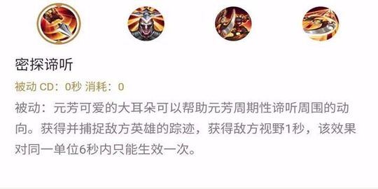 整体分析: 元芳对周围进行侦查,并捕捉敌方英雄的踪迹获得敌方视野1秒钟,对同一单位每6秒只能生效一次。李元芳的被动赋予了李元芳强大的侦查能力,能够发现埋伏在草丛中或者有隐身技能的敌人(如兰陵王),极大程度上提升了李元芳的生存能力与反手能力。