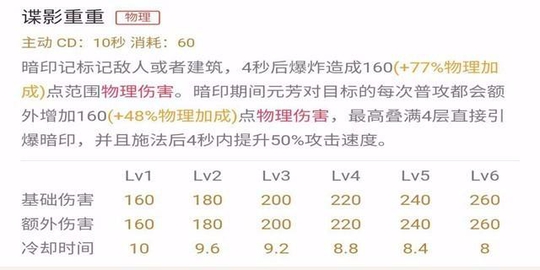 整体解析:李元芳对敌人或者建筑物进行标记,4秒后引爆造成一定的物理伤害。目标被标记期间,每次普攻都会为标记增强爆炸伤害,叠满四层并直接引爆。并且施法后提升攻速和射程。一技能是李元芳最主要的输出技能,能够在短时间内迅速打出爆炸伤害,一技能提供的攻击速度和射程加成增强了李元芳的走A能力,配合红BUFF能打出很好的风筝效果。