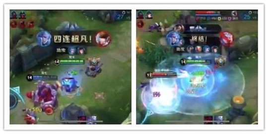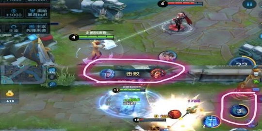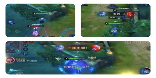 下图中可以看到,发现敌方在我方下路进行gank后立即前去支援。从草丛出来后先靠近露娜利用自己的一技能接二技能刷出被动。位移穿过露娜后发现李白,立刻用大招瞄准。残血的李白立刻被收割。杀死李白后发现了同样残血的铠。露娜在这时候已然选择撤退,而铠也在往己方防御塔下移动想进行逃跑。击杀李白后大招冷却时间大大缩短,等待大招冷却时间结束,越塔强杀,瞄准敌方的凯,这个时候敌方没有支援,诸葛亮顺势完成一波二连击破。
