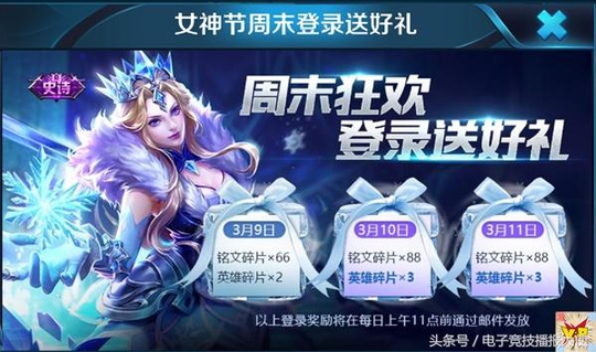 虽说昨天是女神节,但是下面这个登录送好礼的活动是从今天才开始的。3月9日、3月10日和3月11日这三天的时间里,只要登录就能领到8个英雄碎片以及242个铭文碎片。但是目前英雄碎片不怎么值钱,而且一般是58个碎片才能兑换一个英雄。所以在送礼这方面,还是不够有诚意。