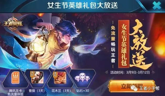 另外女生节英雄礼包限时放送至3月12号为期四天时间,包含了曹操和花木兰三日卡,感兴趣的玩家别忘了领取哦!