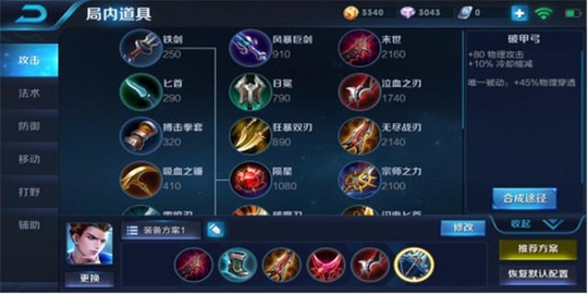 破甲弓:到了大后期,坦克的肉装基本成型,战士甚至法师都会做一两件肉装保命,80点物理攻击和45%的物理穿透可以让狄仁杰在打肉的时候也像砍瓜切菜一样。更何况它10%的冷却缩减可以让狄仁杰的技能冷却的更快,打出更高的伤害。(在大逆风的情况下可以考虑破甲弓换成暗影战斧、影刃换成贤者的庇护或者名刀·司命)。