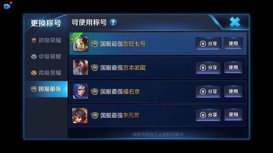 玩家晒出了自己四个国服最强的称号,我们可以看到这个玩家,我们可以看到这个玩家拥有四个国服最强的英雄,分别是鲁班七号和宫本武藏、橘右京以及李元芳。玩家表示自己虽然舍不得,但是还是要弃坑。”因为你走了,整个王者峡谷都是与你的回忆"。