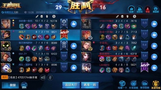 最后的时候玩家所在的队伍获得了游戏的胜率,而玩家也取得了MVP。杨幂阿轲的战绩是4-6-6,虽然是队伍中表现最差的,但是这样的战绩不算坑,毕竟这是王者局。看到杨幂这么高的段位,实在是没想到,毕竟她拍戏实在是太忙了。另外,大家碰到这个ID记得要“拍照留影”!