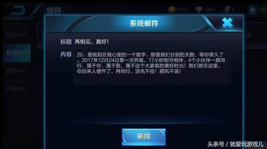 而最近有一个玩家吐槽,说是他收到了来自王者荣耀游戏方的一封非常矫情的邮件。这个邮件的内容是这样子的,20,是铭刻在我心里的一个数字,那是我们分别的天数。等你很久了。2017年12月24日第一次并肩,17小时相守相伴,4个小伙伴一路同行,属于你,属于我,属于这个大家庭的美好时光!我们就在这里,你回来人便齐了,再同行,逆风不投!顺风不浪!