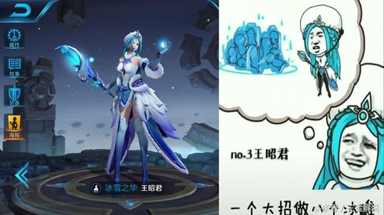 第三位,王昭君。玩家给出的理由是,一个大招做八个冰雕。王者解说觉得好尴尬啊,王昭君的冰冻技能明明是二技能啊,大招不就是单纯的伤害输出技能吗?这大招怎么做出的冰雕呢?不过说实话,王昭君在五军对决中的作用还是非常明显的,毕竟技能CD短,控制效果好,大招的群伤更是变态呢