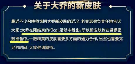 另外,还有一个问题吸引了小曼的注意,那就是团战精神皮肤的制作。可能大家在前段时间看到了所谓的孙尚香和大乔团战精神皮肤,但是今天可以确定是假的了。因为王者荣耀官方都对大乔新皮肤进行了解答,意思很明显,就是大乔即将上线新皮肤,但是需要时间。可以说,大乔将作为团战精神皮肤上线,但是这款皮肤目前还在制作,应该没那么快才对。
