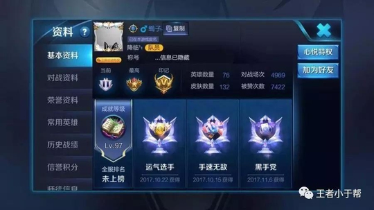 可以看见这位赛战绩的的玩家对战场次为4900多场,被赞次数高达7400多次,可以说是很厉害了,并且最高达到了荣耀王者,而且还有着5个赛季的王者印记,说明是一位非常强的老玩家。