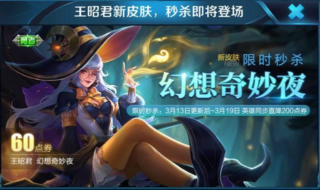 可以看到这款皮肤就是王昭君的幻想奇妙夜,就图案上来看我觉得还是非常不错的,感觉像一个魔法小巫女,在3月13号更新后到3月19日这一周的时间内可以用60点劵,也就是六元来购买。同时,英雄也会将200点劵,不过王昭君这个英雄。用金币购买的话也比较便宜。只要8888金币,所以说想买这个皮肤的人。最好先把英雄给买了。