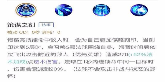 整体分析:诸葛亮的被动的特点在没有CD、伤害较高。这给予了诸葛亮很高的清线能力和对线威胁度;在团战人数多的时候,诸葛亮的印记往往能更快生成,是诸葛亮重要的输出来源。