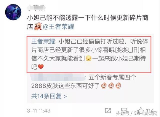 而昨天下午,有玩家在微博询问到,碎片商店什么时候可以更新呢?官方表示,碎片商店更新了许多小惊喜,相信不久大家就可以看到了。这个不久 多久呢,小编觉得很有可能就是明天了,因为明天就会有一次更新,同时上架白色情人节活动。看到这里有不少玩家猜测这个惊喜到底是什么,有玩家表示,可能是三天内上架全皮肤?毕竟有些皮肤从来没有上架过皮肤商店,只能通过点券来购买,这次上架无疑是一次大福利啊!