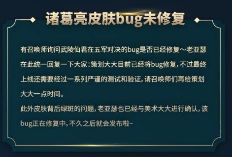 对此,策划表示已经 将BUG修复 ,并且对于皮肤美术的绿斑问题,也正在紧急处理中。