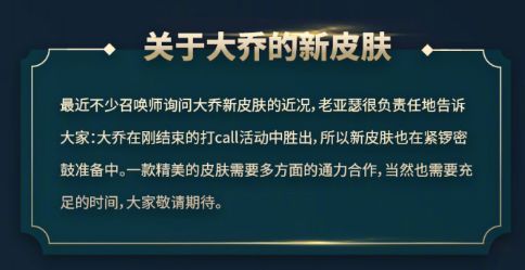 而备受关注的 大乔新皮肤 上线时间,在玩家们的不断追问之下,老亚瑟终于出来表态了,他说:“大家敬请期待”。