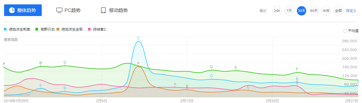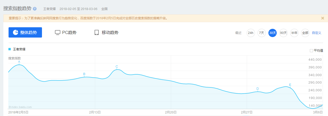 本司机曾经也以为吃鸡热度来临后《王者荣耀》会凉,根据目前的数据来看《王者荣耀》、《LOL》这种现象级游戏,没事热一热,多更新下版本热度还是会回升的。不过依靠全新玩法“五军之战”扭转颓势的《王者荣耀》更让人觉得是回光返照,在三月开始百度指数就不断走低。