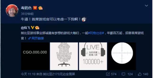 近日,国内知名手机厂商努比亚旗下游戏事业部在网上公开招聘游戏人才,其中最为引人注目的是丰厚的薪酬,尤其是首席游戏官一职,百万年薪起步,最高达160万的巨额薪酬,就连电竞圈知名大佬毒奶色也直呼NB,转发微博并评论"可以考虑一下我"!