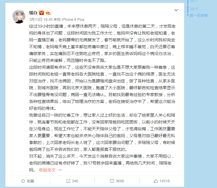 然而骚白突然发了一条微博,“”经过39小时的直播……才发现老妈的身体出了问题……“,在这条长微博中,用絮絮叨叨的语气说着这几天来的经历~骚白“重新出现”并发声解释无疑也让业内之前所散布的对他“不友好”的谣言不攻自破?