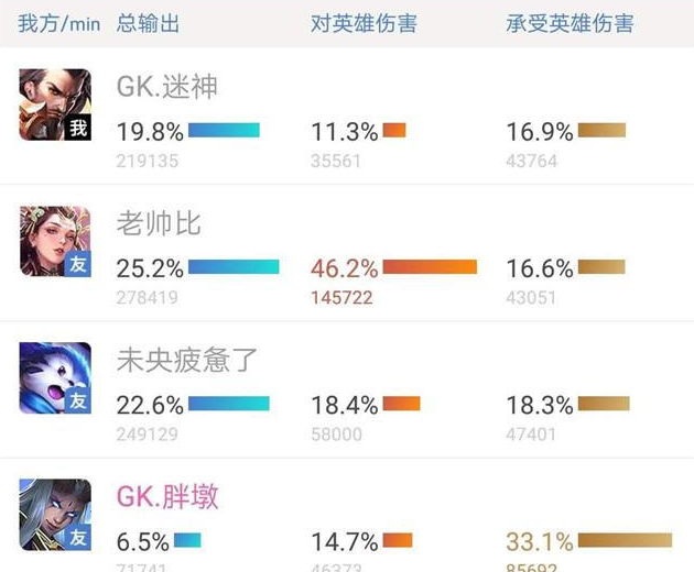 从这张图里面可以看到老帅在GK的一场练习赛里面使用了杨玉环这个英雄。并且打出了46.2%的伤害,应该是一个中单法师。不过就算最强的中单法师要打到40%多的伤害还是非常困难的,看来他已经掌握好了这个英雄的精髓,那么很可能就会在之后的比赛中出场了。