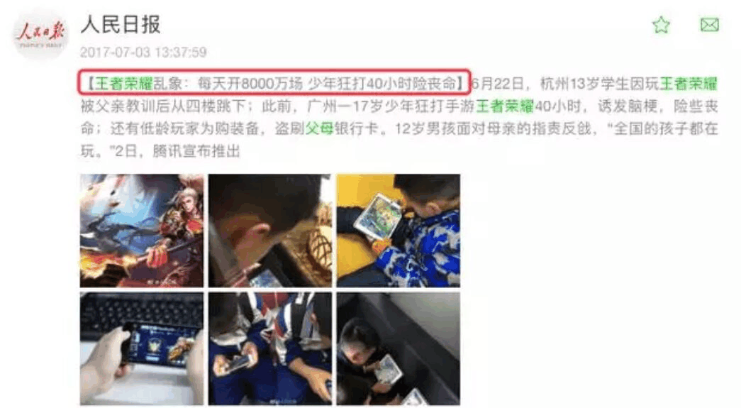 王者荣耀从一上线就横扫整个MOBA手游市场,吸引的人群覆盖面更是广之又广,从小学生到中年人,从进城务工的农民工到各路演艺明星,让人为之一振。王者荣耀自诞生以来,负面资讯就不曾断绝,南京警方侦破了一起网上倒卖公民信息的案件,当民警冲进嫌疑人住处,嫌疑人提出一个要求:容我打完这把王者荣耀。网友感叹,农药之毒竟至于斯!还有报道称少年狂打王者荣耀40小时险丧命。