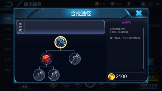 增加80攻击力、10%冷却缩减,被动增加45%物理穿透。合成需要陨星(1080)+铁剑(250),总价2100。