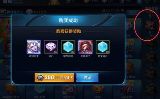 第二张积分夺宝截图:与第一张图片不同,这次是一个五连抽,并没有抽到荣耀水晶,但抽到的东西也不差,有冰冠公主、死神来了两个极品皮肤。另外,与第一张图片相比,这张图片似乎没用什么疑点,只要有相当好的运气,每一个玩家都能完成。不过,正因为这样的运气不是每一个玩家都能有,才得到了众网友的调侃和吐槽。