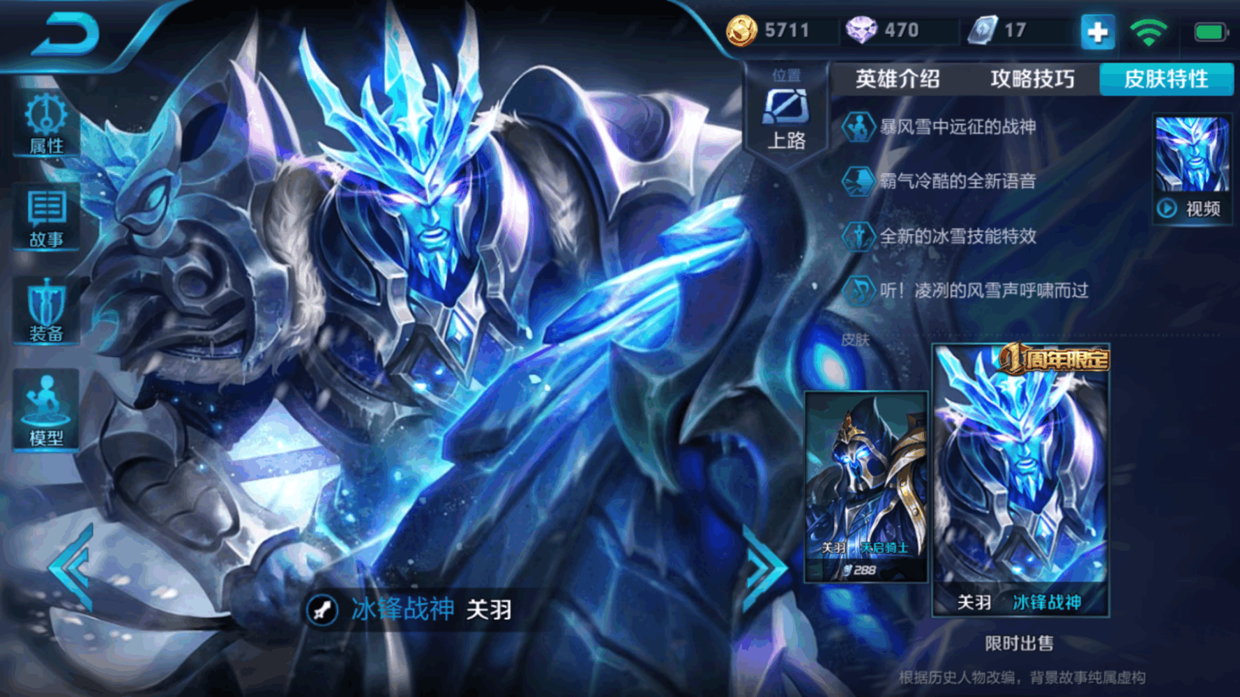 4:关羽的冰锋战神,一周年限定,那个时候游戏名都还不叫王者荣耀,作为一款很好玩的游戏,当时也是不怎么出名,很多玩家还不了解这个游戏,所以推出的这款皮肤,是很少人有的,如果有这个皮肤的玩家,都是王者峡谷老字号的关羽代言人了。如今能不能返场也不好说,毕竟这个英雄很少人玩的来,操作真滴难,反正小编是玩不来。