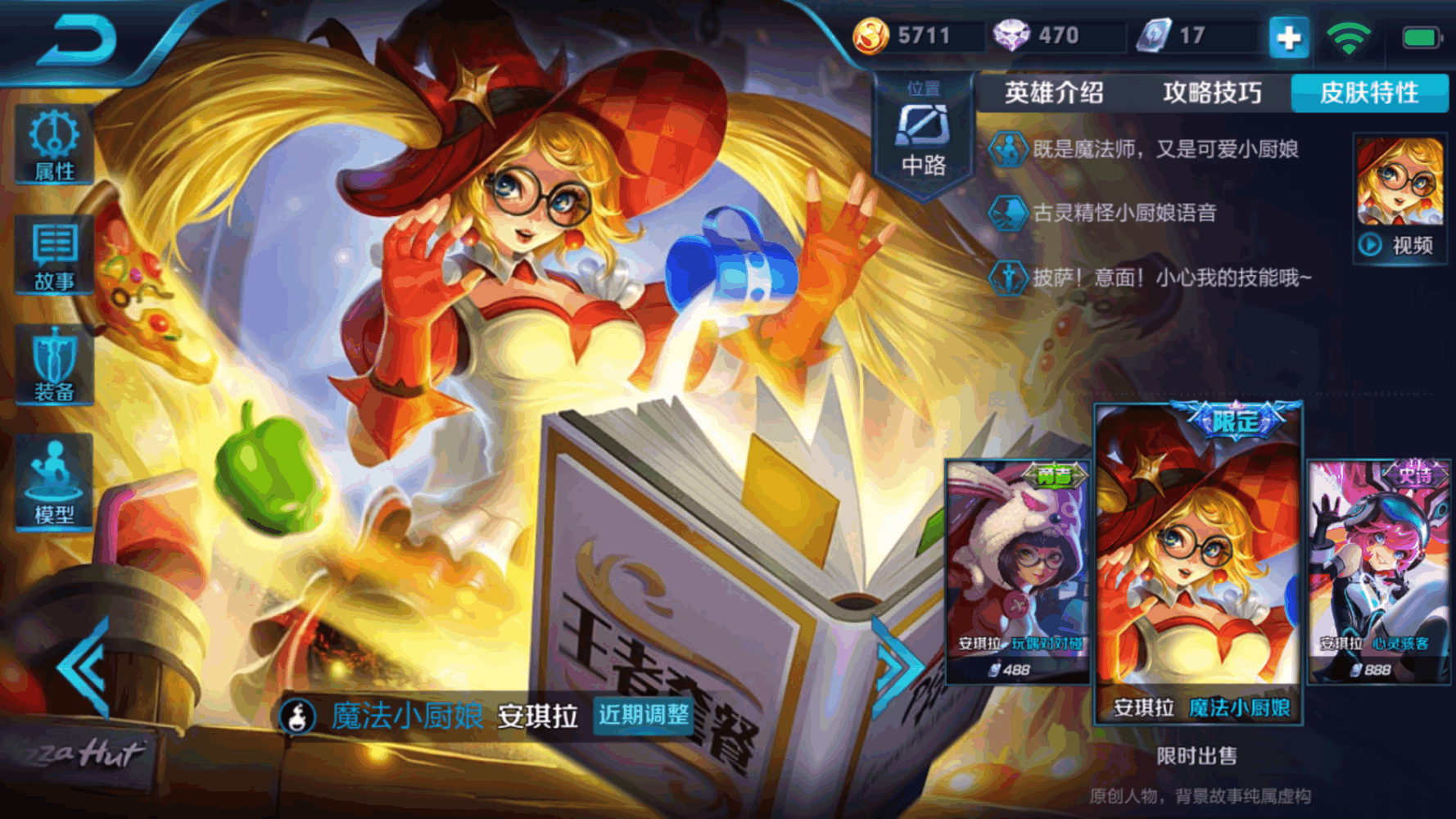 2:安琪拉魔法小厨娘限定皮肤,很多人都说这款皮款带“广告性质“,是的,没错。这是一款必胜客与王者荣耀合作推出的一款皮肤,当然有”广告性质“啦!而且重点是,这款皮肤是吃出来的,就是通过去“必胜客”吃套餐产品可以免费吃出来。