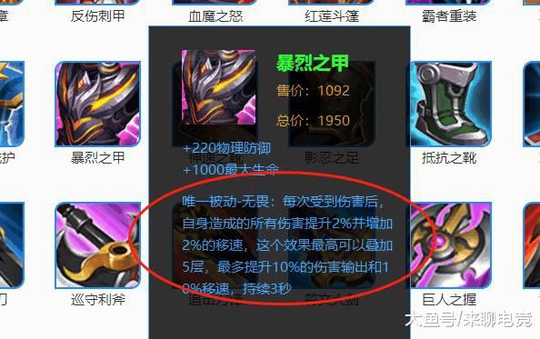 暴力之甲:坦克和那些扛伤型的辅助最大的区别在哪里?扛伤型辅助,当然是先扛伤,然后增益保护队友、负增益敌人,比如受到攻击后减速敌人,因此像牛魔、张飞这类坦克更应该出不详征兆等。而坦克英雄呢?他们首先是扛伤,然后就是输出了,要知道他们也是需要打输出的,而暴烈之甲在让他们有防御能力的同时,加攻击力和移速的唯一被动让他们这些坦克也能很爆发,很灵活!