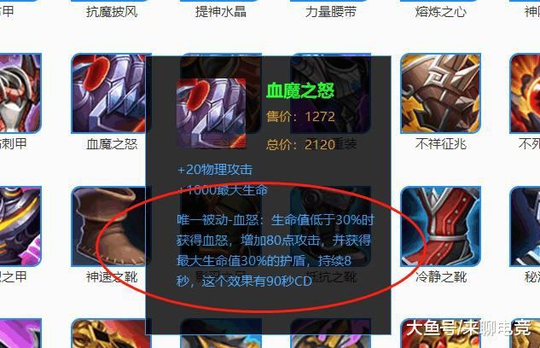 血魔之怒:血魔之怒这件装备如果你没用过,是永远体会不到它的妙处的。当你出了这件装备之后,你就会在某一时刻发现,为什么残血了还这么厉害。没错,那是它的唯一被动发挥作用了。生命值低于30%的时候,获得血怒状态,不仅大幅提升防御能力,而且攻击力也大幅提升!