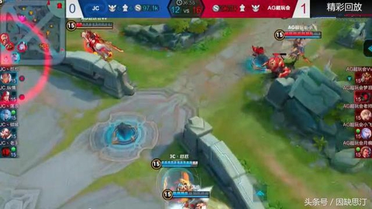 在这场比赛中,梦泪选择的英雄是打野娜可露露,而韩信则被对方的纵情选掉。这时,超玩会在对方高低前想要打团一波的时候,JC、纵情已经把兵线悄悄推到对方高地前。