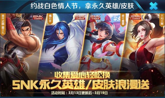 在奕星和张良上线的前一天,也就是白色情人节手机爱心兑换snk英雄的最后一天,不知道各位小伙伴兑换到了自己喜欢的snk英雄了么。