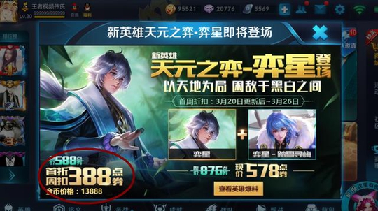 而今天登录游戏后小伙伴应该都看见如下图,上线首周价格为13888金币同时还要288的踏雪寻梅皮肤一同上线。