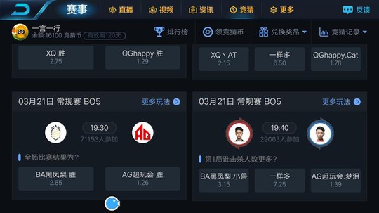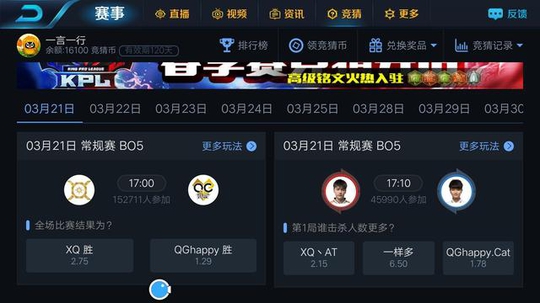 我们来看一下竞猜的情况吧,前两天给大家说了揭幕战是xq对阵qg。以目前的赔率来看,xq的赔率是2.75,而qg的赔率是1.29,这个真的让人也不好下注啊。下qg的话就算赢了也赢不了多少,还有一定风险,而下xq的话,确实也没有绝对的把握。至于后面的谁击杀人数最多,主要还是看阿泰究竟玩什么位置?