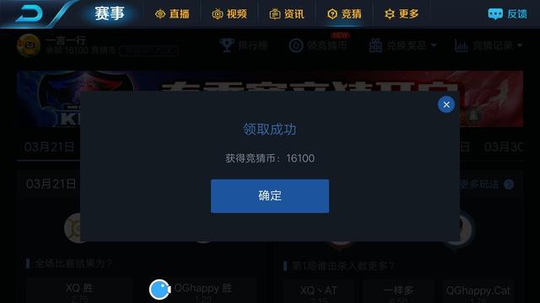 入口就在官方的游戏启动页面的赛事那一栏里。由于大家可能只会在KPL直播的时候才会去观看赛事这一栏,所以说一般也不会有太多的人注意,但是现在我们已经可以领取竞猜币来换东西了。