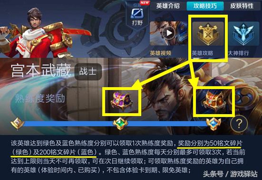 以上三种方式比较常见,除此之外随着新英雄的上线,玩家每入手一位英雄并将其打到蓝色熟练度(精英级别),即可获得250铭文碎片,还未领取的小伙伴可以进入游戏大厅英雄选项界面进行熟练度排序,之后通过展示界面中的英雄攻略可以看到领取宝箱的banner,如下图所示: