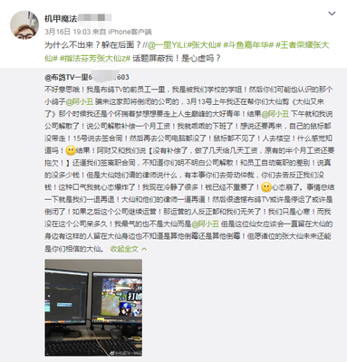 暂且不论这件事情真实性以及具体的内情,从去年张大仙从企鹅电竞跳槽到斗鱼,背负巨额违约金;到后来跟前女友灰灰闹掰,在微博披露出关于张大仙的一些内幕消息,其中就包括之前的一些公关文等等;到现在又被曝光拖欠员工工资。在员工三角爆出大仙拖欠工资一事后,大仙的前女友灰灰再次发声,并点赞了三角的微博长文。