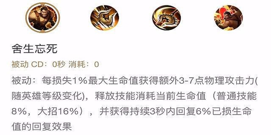 技能解析:损失生命值获得攻击力,这就是程咬金的核心玩法,对于自身血量值拿捏,保证自身不死的前提下,尽量压低血量来获取更高的攻击力。使用技能消耗生命值的特点让程咬金能主动降低自身血量,而使用技能回复已损生命值的特点又能帮助程咬金在血量极低的时候回复少许生命值。