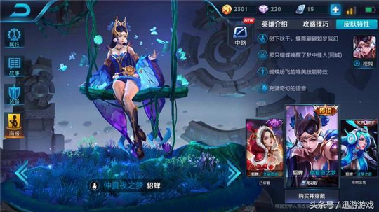 貂蝉的首款传说皮肤,在经历天美无限跳票后终于在玩家的万众瞩目中登场。陷入灵感危机的作家在夏日洋溢的花香的午夜邂逅了施展让人们在仲夏夜进入美妙梦境魔法的精灵,写出了世人传颂的爱情佳作。诗意的皮肤名字,如梦似幻的皮肤特效,奇幻的背景故事。