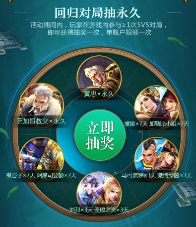 另外,在这个官方的返场皮肤宣传界面,还有两个小活动,一个是回归对局抽永久英雄的活动。可以看到,这次的永久英雄是黄忠和他的皮肤,另外的都是其他的一些英雄和皮肤的配套,不过是限时的。黄忠这个英雄在体验服已经重做了,大招只能攻击五下,更看重大家的使用时机了。