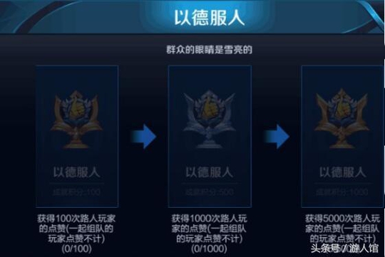 游戏中还会增加一些成就,如上图中的以德服人,并且这个成就大家可以看到,只能通过路人玩家来点赞获得。所以指望组队的朋友来帮你点赞是不现实的,什么时候才能让自己的技术真正的征服陌生人呢?另外,大家都知道最近增加了一个王牌系统,怎么上路金牌呀,中路银牌这些,这些之后也会出一个相关的成就。