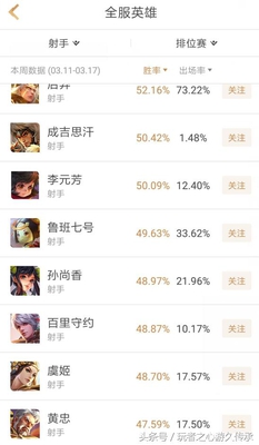 从玩家的反响来看,看好的基本是奔着黄忠的爆发力去看,而看衰的则认为黄忠不能守塔了作用没有之前强大了。但我觉得这对黄忠是个不错的改动。目前的机制黄忠主动团的作用明显提升。至于守塔的问题,难道带其他的射手就能够守塔了吗?同时这里也透露出一个问题,是否用的人少了就会得到加强的机会呢?我们来看下排位赛中射手的胜率榜。