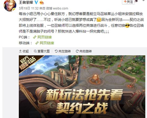 昨日王者荣耀官微,正式爆料新模式契约之战,5VS5模式下玩家竟然可以操作两个英雄。新模式将会在5-6月上线。上千条评论大家都觉得王者荣耀的游戏可玩性越来越多了,至于能不能超过lol,那就不知道咯,小编跟大家一起拭目以待吧!