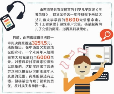 日前山西省临猗县法院一审判决商家返还3251.5元。法院指出,在中西部欠发达地区的农村,一个未成年人短期频繁大额充值Q币6000余元,对普通农村家庭来说是难以想象的,这明显超出了普通群众可以接受认可的未成年人交易的范围,商家的做法有过错。