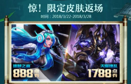 就在刚刚,腾讯游戏的微信公众号爆料了天魔缭乱以及逐梦之音的具体返场时间,3.22-3.28日限时出售,与前段时间爆料相差不多,当然返场基本不会打折,逐梦之音售价888点券,天魔缭乱售价1788点券,两款皮肤总价2676点券,这一下就是270元,虽说不多,但对于大多数为学生的吧友来说也是一笔不小的支出,建议有圣诞限定的无需再购买这款皮肤,天魔显的比较笨重,圣诞也是非常不错的,对于信仰玩家来说您可以当我前面那句话没有说过。