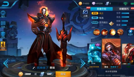 曹操的这款皮肤需要点券夺宝才能获得, 整体造型还是有待优化,同样是点券夺宝获得的王昭君偶像歌手都优化过一次,曹操的造型是不是也该考虑优化一下呢,毕竟烛龙的效果都不比这款死神来了皮肤差。